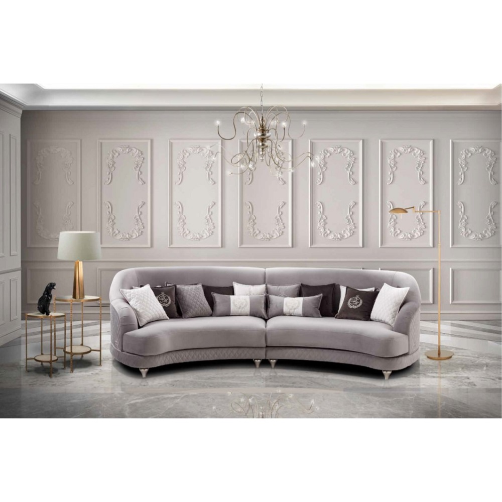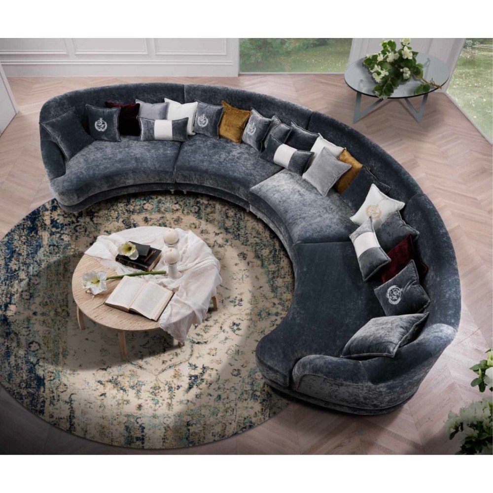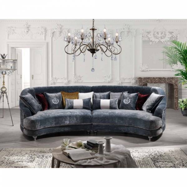 Magnifique canapé moderne et tendance. Structure en bois panneaux de particules. Revêtement velours. Dossiers amovibles. Sa forme en demi cercle lui donne un style unique. Conçu pour durer dans le temps. Coussins d’ameublement inclus. Dossiers partiellement déhoussables