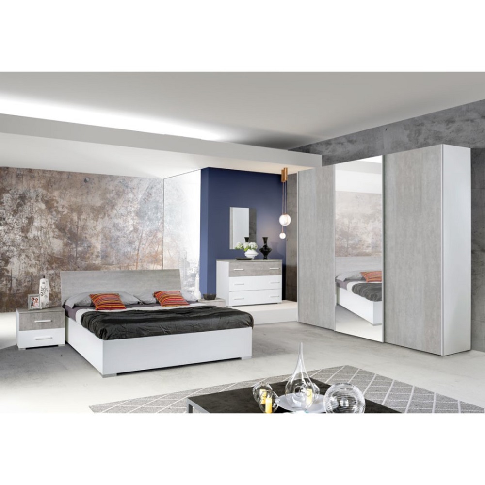 Magnifique chambre à coucher moderne. Structure en mélèze. Finition structure en mélèze blanche. Finition frontale en oxyde. Lit avec sommier et coffre de rangement intégrés. Plusieurs options au choix