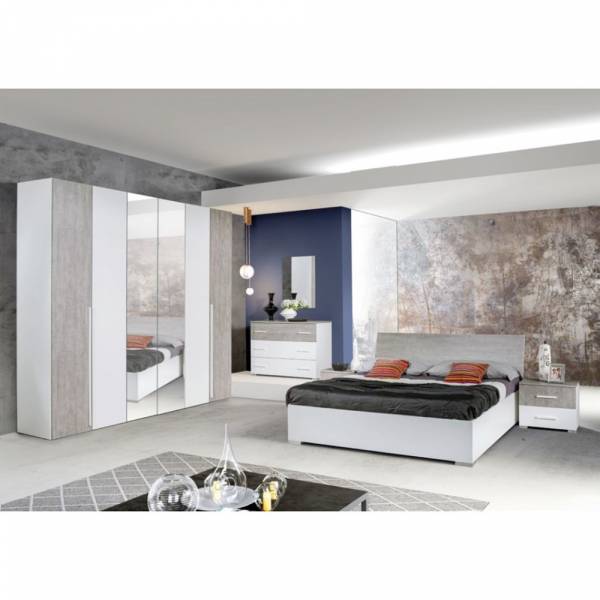 Composition: lit coffre 160X200 + armoire + commode + 2 chevets + miroir