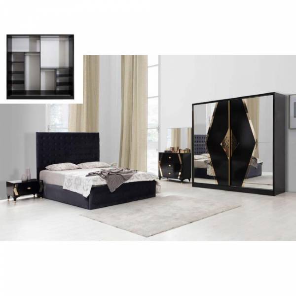 Magnifique chambre moderne au meilleur rapport qualité prix. Structure en bois panneaux de particules. Revêtement lit en tissu velours. Tête de lit rembourrage mousse HR .