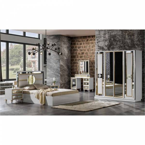 Composition: lit(160X200) + armoire portes coulissantes + coiffeuse + 2chevets + miroir