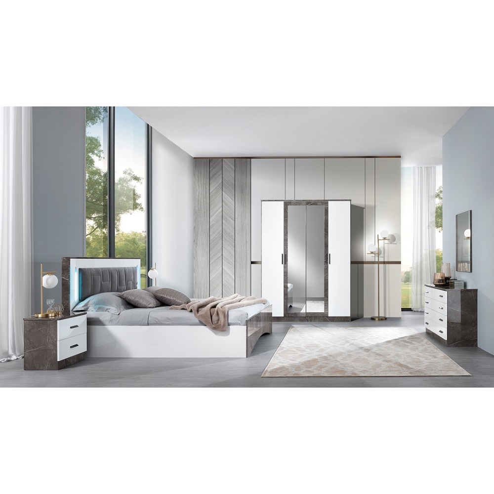 Magnifique chambre à coucher complète moderne. Structure en marbre gris foncé. Tète de lit Led tapisser.