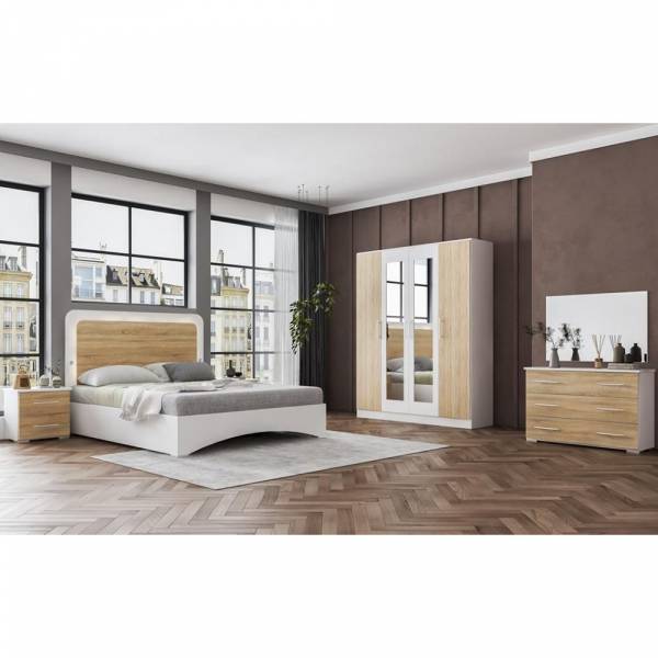 Composition: lit + armoire 4 portes + commode + 2 chevets + miroir