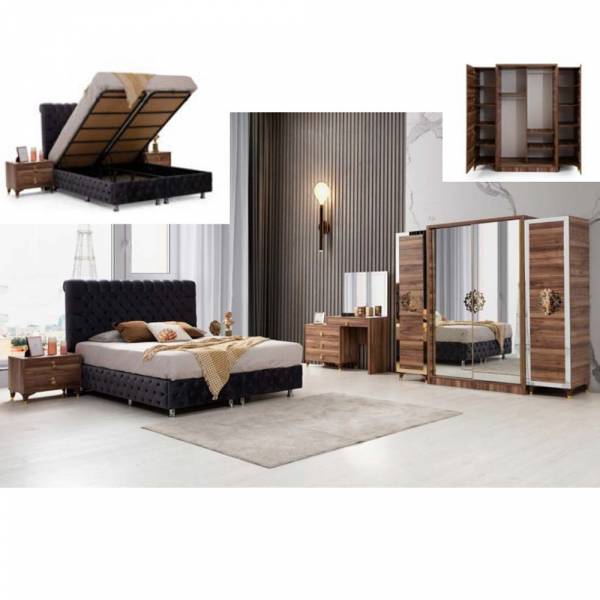 Magnifique chambre moderne au meilleur rapport qualité prix. Structure en bois panneaux de particules. Revêtement  lit en similis cuir avec rembourrage mousse HR. Lit avec sommier et coffre intégrés.