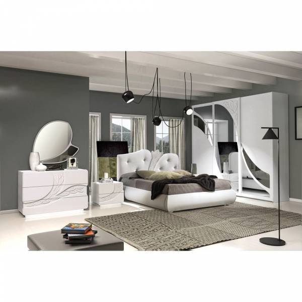 Composition: lit 160X200 + armoire 2 portes coulissantes + commode + 2 chevets + miroir.