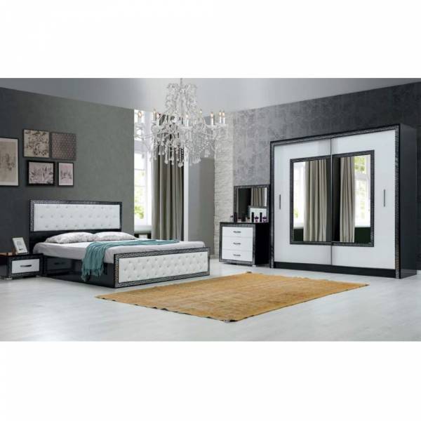 Composition: lit(160X200) +armoire 2 portes coulissantes + commode + 2 chevets + miroir.