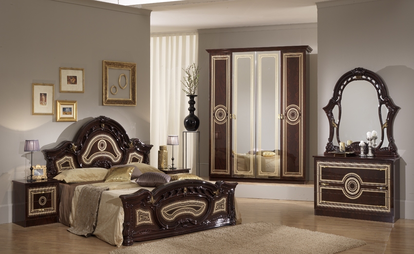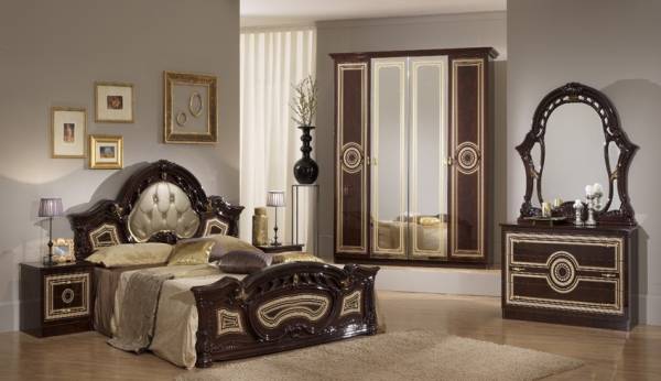 Magnifique chambre complète néobaroque et tendance. Structure en bois laqué. Tête de lit capitonnée similis au choix.