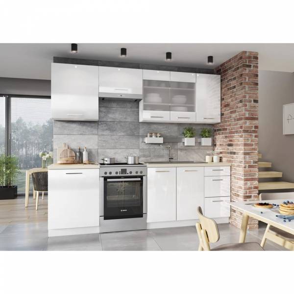 Magnifique kit de cuisine pré composé de 2.40M. Structure et façade en panneaux de particules. Meuble four encastrable et colonne four au choix. Vendu sans plan de travail et électroménager. Le kit est composé de 7 éléments