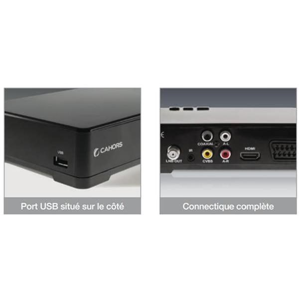 Connectique : 1 sortie HDMI (1080p) – 1 sortie Péritel – 1 sortie RCA Vidéo – 2 sorties RCA Audio (G/D) – 1 sortie Audio SPDIF Coaxiale