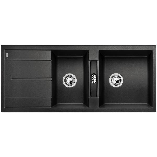 Evier Métra 8S Silgranit PuraDur II – 2 grandes cuves très profondes + égouttoir cannelé – Pour sous-meuble de 80 cm – Livré avec bondes à panier Ø 90 mm manuelles inox et siphon Ø 40 mm à culot démontable avec 1 prise machine à laver. Coloris anthracite.