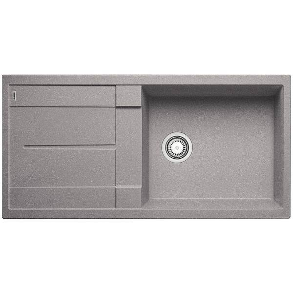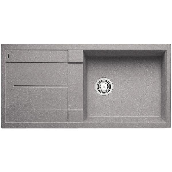 Evier Métra XL 6S Silgranit PuraDur II – Une grande cuve très profonde (49x43x19) + égouttoir cannelé – Pour sous-meuble de 60 cm – Livré avec bonde à panier Ø 90 mm manuelle inox et siphon Ø 40 mm à culot démontable avec 1 prise machine à laver. Coloris alumétallic.