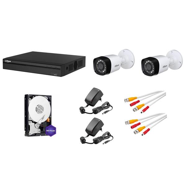 Kit de vidéosurveillance complet comprenant : 2 caméras Tube HDCVI 720P (HACHFW1000R) + 2 alimentations 12V (ALIMDC12V) + 1 enregistreur HDCVI Tribrid 720P (HCVR4104HSS3) + 1 disque dur 1To (DD1T) + 2 cordons vidéo combiné (BNC + Alimentation) de 18m (VSC180WS).