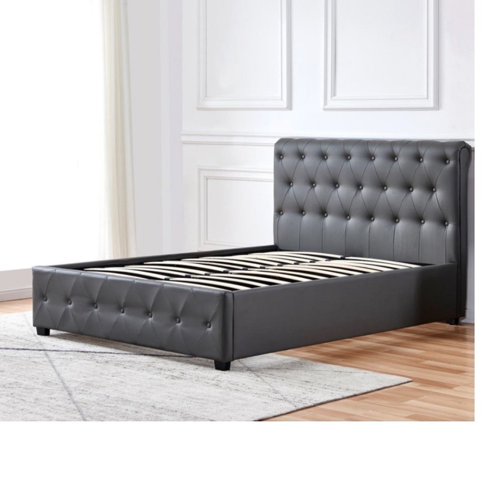 Magnifique moderne avec tête de lit capitonnée. Structure en panneaux de particules. Revêtement similis cuir. Sommier latte intégré.