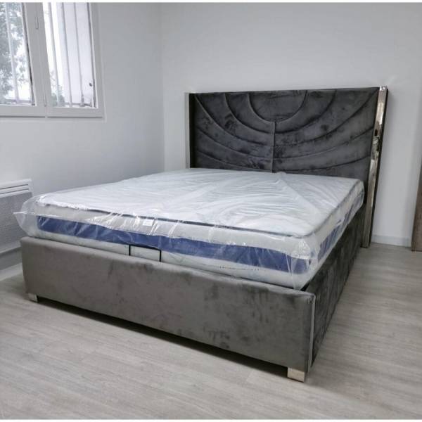 Magnifique lit adulte moderne avec sommier latte intégré. Structure en panneaux de particules. Revêtement velours. Plusieurs options au choix.