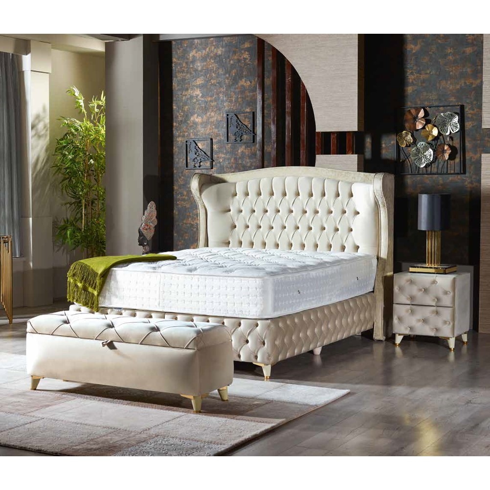 Magnifique lit avec coffre de rangement et sommier intégrés. Design moderne s’adapte à tout style de décoration. Tète de lit capitonnée. Vendu au choix avec les accessoires.