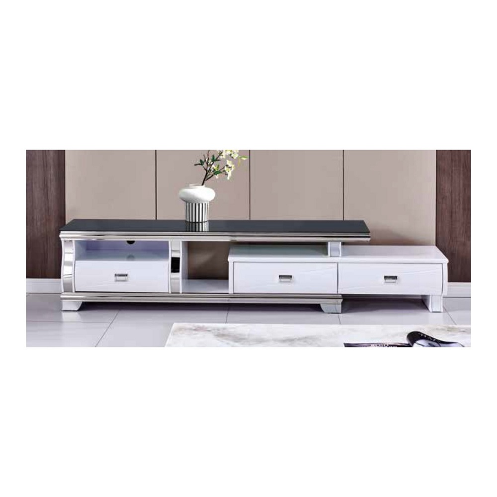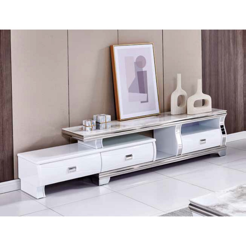 Magnifique meuble TV moderne avec rallonge de 80CM.3 coffres à tiroirs intégrés. Plateau style marbre