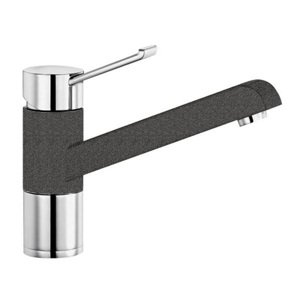 Mitigeur Blanco Zenos mono-trou avec bec coulé orientable à 360° – Mousseur anti-tartre – Alimentation par flexibles métalliques (L = 45 cm avec clapet anti-retour) – Plaquette stabilisatrice – Embase Ø 50 mm – Chromé Silgranit anthracite.