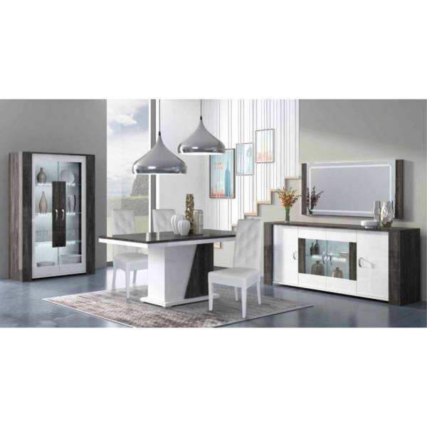 Elégante salle à manger complète moderne . Structure en bois laqué. Ce lot de meubles très tendance est aussi esthétique tant à la finition offre un rendu unique. Conçu pour durer dans le temps. Revêtement  assise et dossier chaise en similis