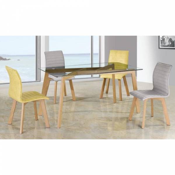 Magnifique table à manger pour salon. plateau en verre transparent et pieds en bois. Vendue sans les chaises