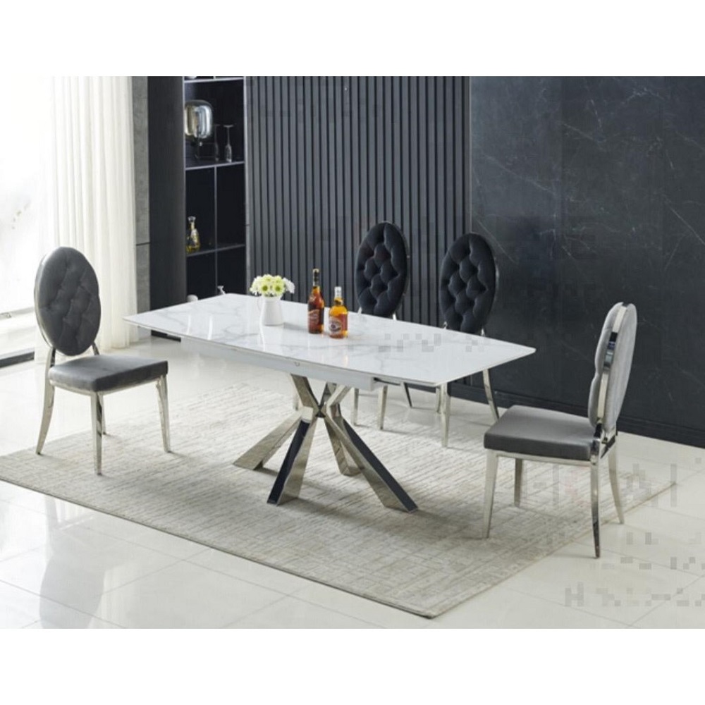 Structure en metal et plateau en effet marbre. Rallonge de 40CM. Vendue sans chaise
