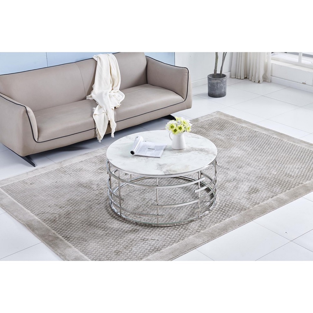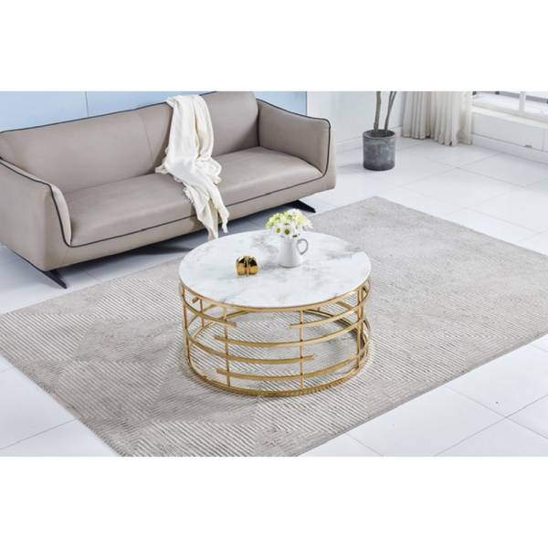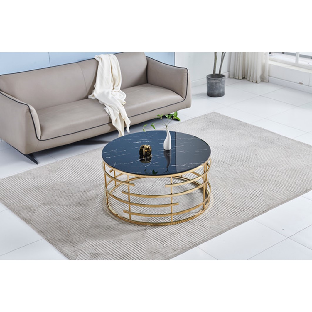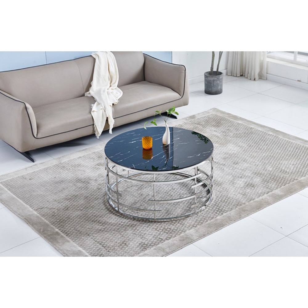 Magnifique table basse ronde moderne et tendance de salle à manger. Structure en metal. Plateau en effet marbre.