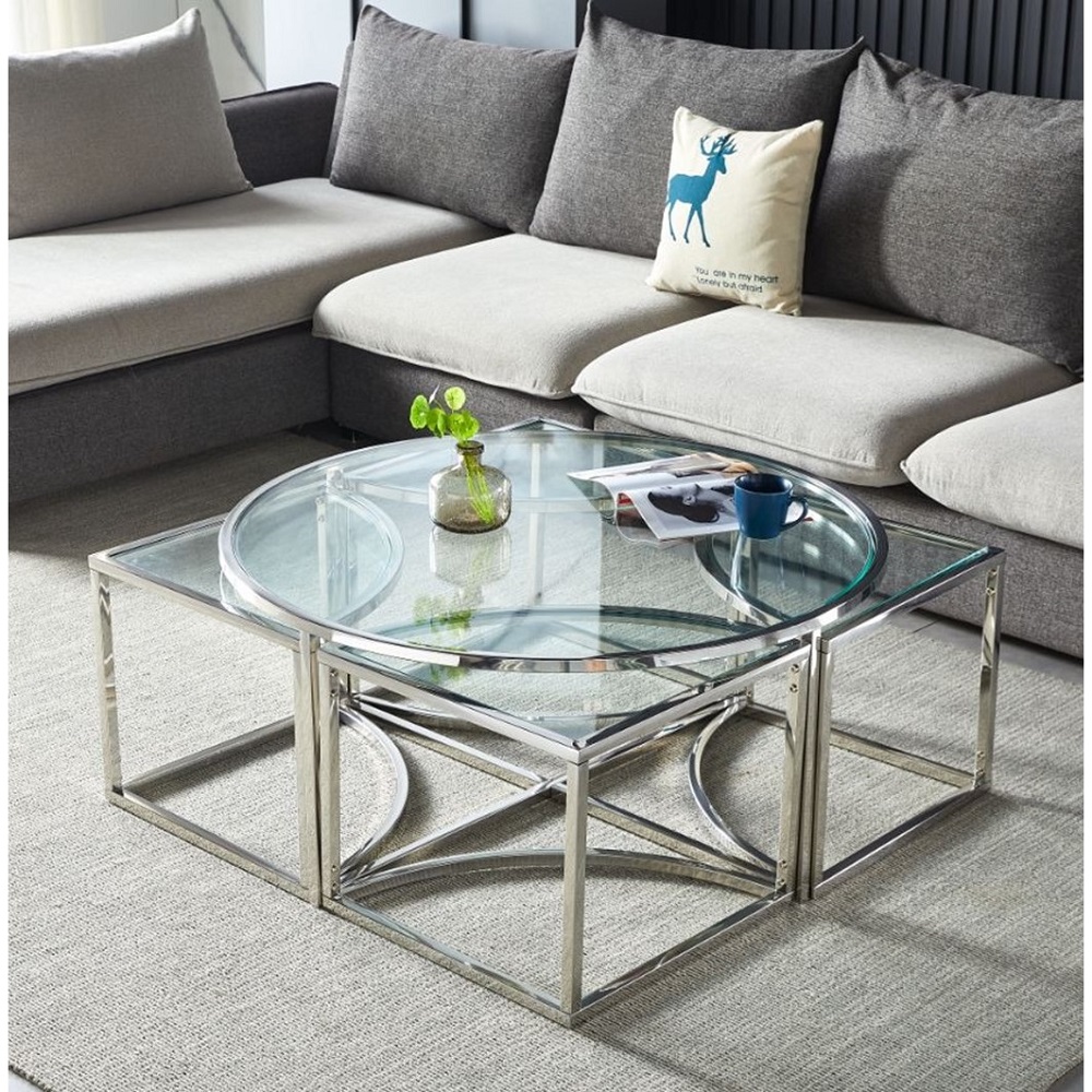 Magnifique table basse ronde moderne et tendance qui illuminera la décoration de votre salon. Structure en metal et plateau en verre transparent.