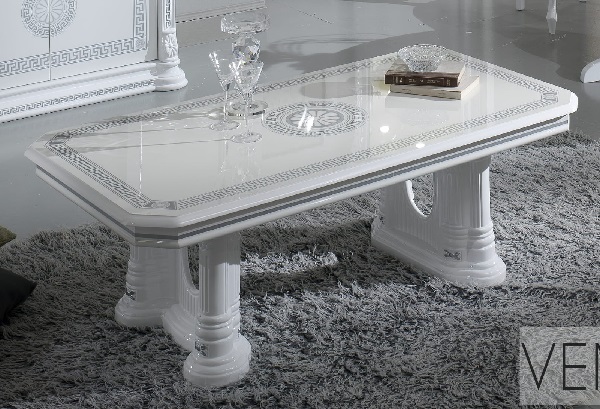 Magnifique table basse salon rectangulaire au design néobaroque. Structure en bois laqué.