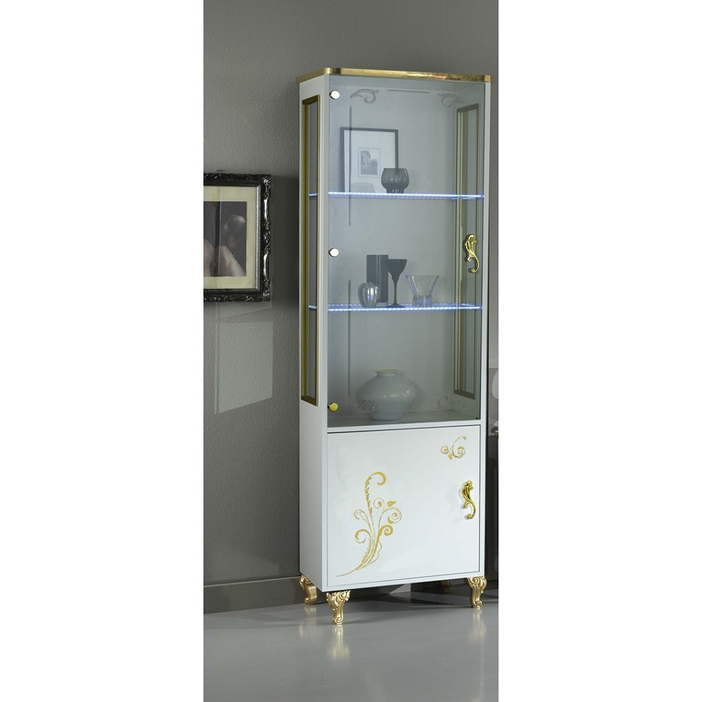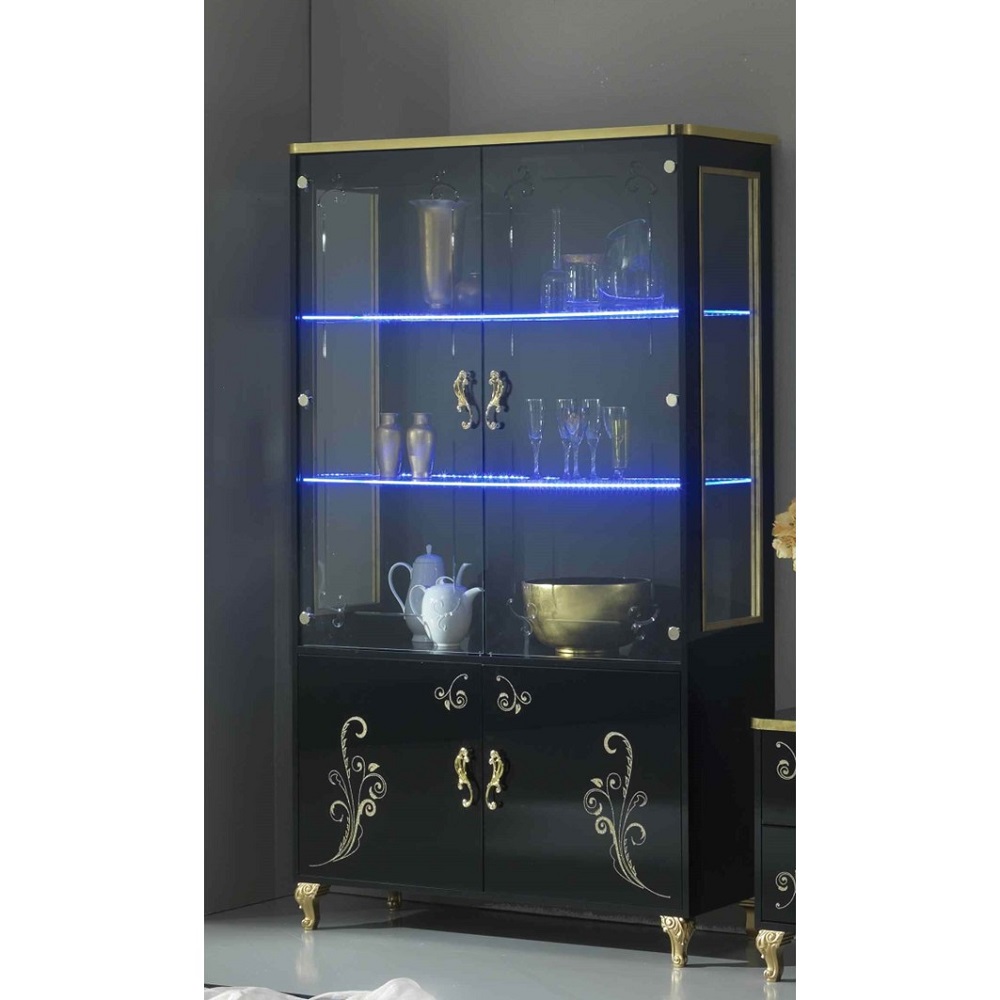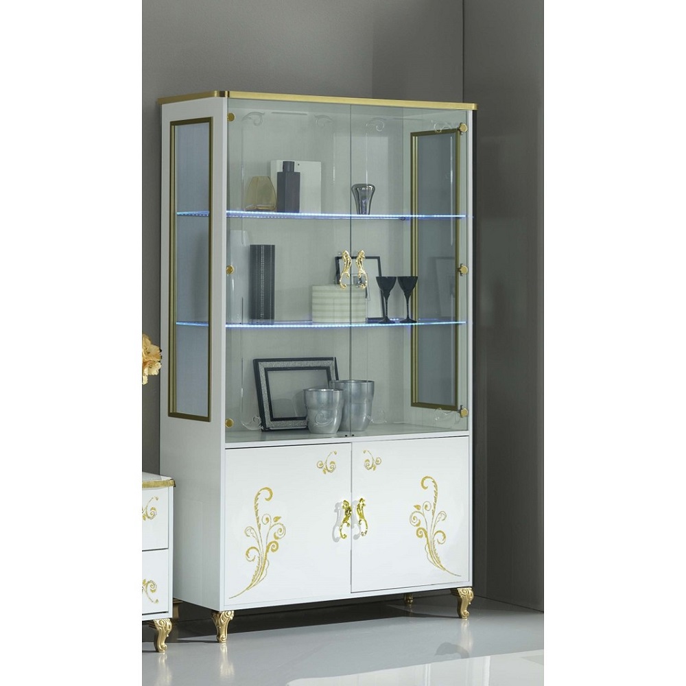 Magnifique vitrine moderne et tendance de salon avec Led intégré. Structure en bois laqué. Idéale pour le rangement des objets de décoration.